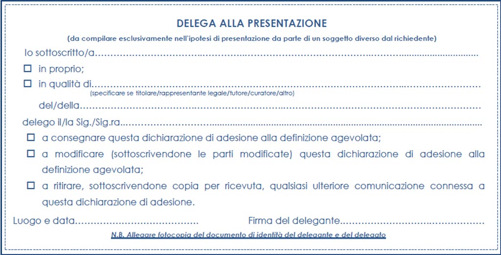 Il modulo delega deve essere compilato in caso di presentazione della domanda parte di un soggetto diverso dal richiedente. In tal caso, occorre allegare fotocopia del documento d’identità del delegante e del delegato.
